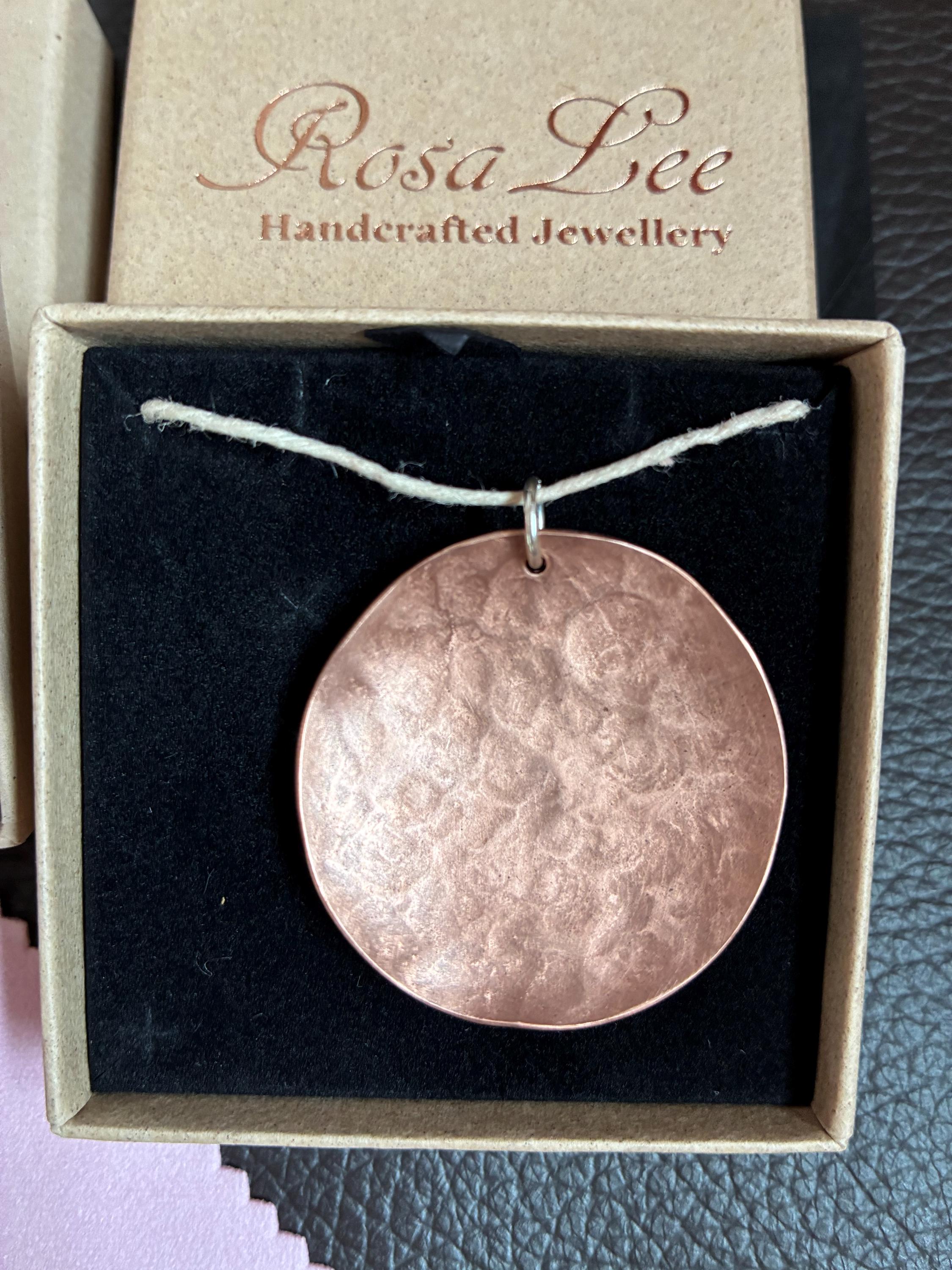 Excellent quality copper disc pendant. It looks fabulous. Exactly as described. Good value. Well packaged. Im absolutely thrilled wth my pendant!